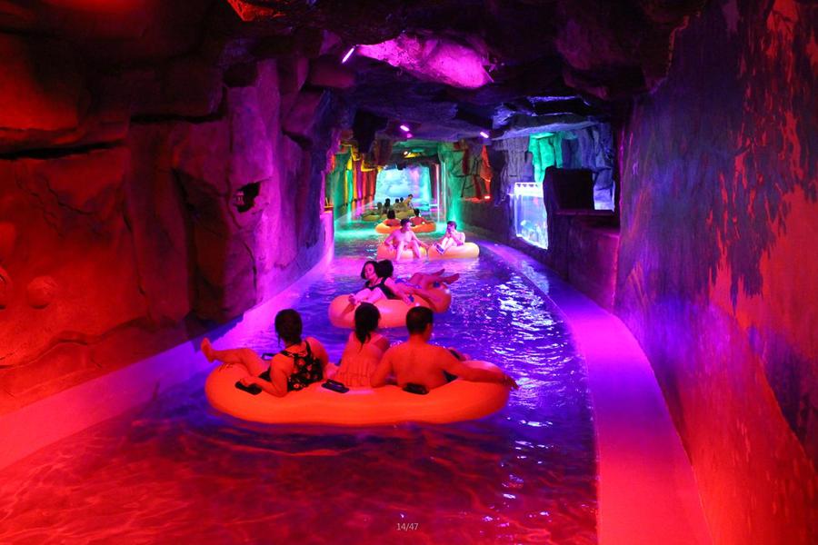 一楼;温泉养生馆集大小不一、功能各异的温泉养生泡池、多功能水疗区、大型造浪池、儿童(成人)游戏水寨、亲亲鱼疗、池壁按摩、气泡浴、矿砂浴、边际游泳池、地下漂流河于一体;