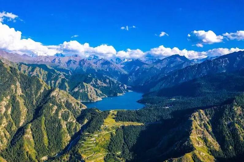 天山天池,古称“瑶池”又有冰池、神池、龙湫、龙潭之称,博格达峰下的半山腰,东距乌鲁木齐市110公里,海拔约1980米。它是世界著名的高山湖泊,以完整的垂直自然景观带和雪山冰川、高山湖泊为主要特征,融森林、草原、雪山、人文景观为一体,风光别具一格。以天池为中心,北起石门、南到雪线、西达马牙山、东至大东沟,有完整的4个垂直自然景观带。