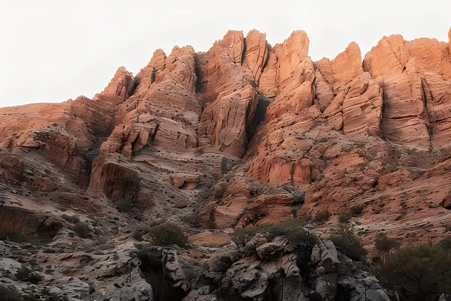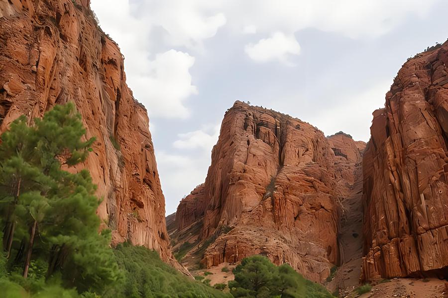 峡谷内奇峰异石千姿百态,有神犬守谷、通天洞、旋天古堡、玉女泉、一线天、月牙谷、幽灵谷、冷风洞等40处之多。造型生动,形态逼真。峡谷平均海拔1600米,最高山峰2048米。站在峡谷开阔的入口,四周全是高大的红色山体,阳光照射下,犹如一簇簇燃烧的火焰。尤以谷口处的三座山体(乃头山、丽人山、佛面山)最为壮观。特别在夕阳斜射,朝霞映山,极目远眺,色艳红天。大有不是火焰山,胜似火焰山之奇感。