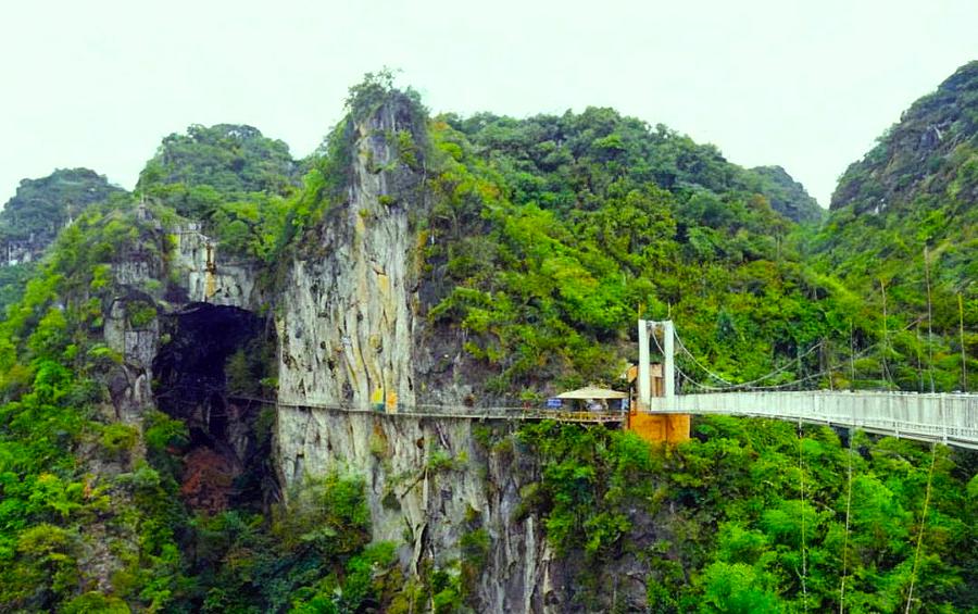 景区最神奇的是它的三个岩洞,上洞、中洞、下洞,这些岩洞洞洞相连,从地下暗河直至山峰顶部。下洞以洞中河闻名,地下暗河的溶洞石壁装饰了靓丽的七彩灯,移舟换影,似一场地底梦幻行。中洞以宽广和高大闻名,相传石达开就是在这个洞里和头领们开会,决定下一步的行军路线。上洞则以石上雄健的书法笔力吸引游客,石刻的历史声音似乎还在回响。