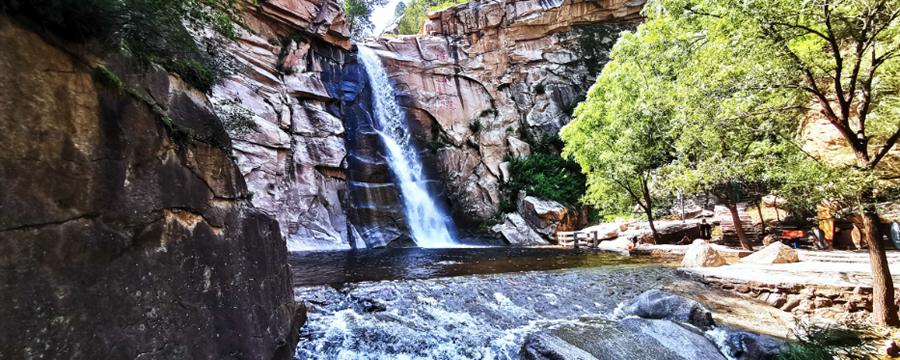 为一体,海拔约350米,水从百米长的陡壁上翻卷而下,飞瀑凌空,其声如雷,烟雾弥漫。水击打在峭壁上卷起朵朵水花,犹如银龙翻身,嬉戏山间。