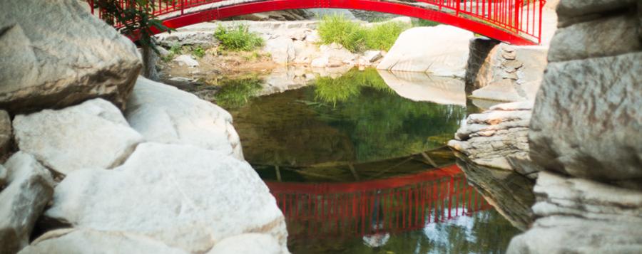 位于双子望秋上游,面积约80平方米,呈圆形,水面平如明镜,镜潭上方架有一座约12米长的朱桥,桥身与潭水相映成辉,游客步于桥上,临水照“镜”,人影、水中倒影交相呼应。