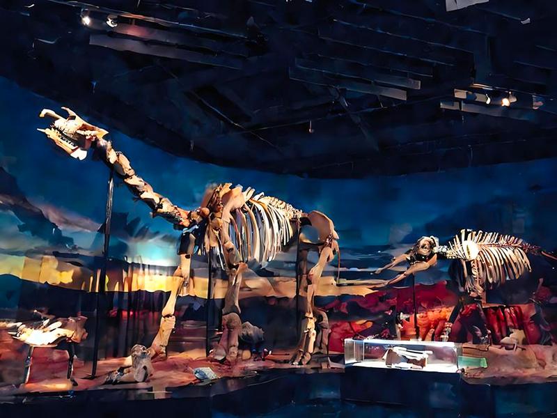 巨犀化石是1993年兰新铁路复线修筑过程中在吐鲁番东部的飞跃火车站发现的,是陆地上曾经生存过的最大的哺乳动物,属奇蹄目超科的巨犀类,其主要特征是它们的大,肩高4米,头长加上体长约7.3米,体重15吨,它生活在距今2400万年以前的渐新世,以植物(树和灌木的叶与嫩枝等)为食。在展览中运用了声光电等高科技技术,通过实物、图片、场景、模型、多媒体查询、幻影成像等多种展示手段。