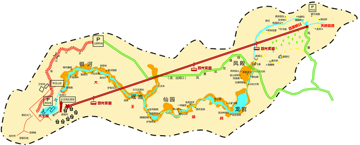 整个洞体时宽时窄,宽旷处如会展大厅,足可容纳数千人,顶端深邃空旷,狭窄处暗道幽巷,需要厕身低头而行。全长3500米,洞内常年恒温18摄氏度,天然河流穿洞而过,共分为“凤殿、龙宫、仙园、瑶池、银河”五大部分,洞中有洞、洞中有河、山重水复、峰回路转。洞内奇石林立,怪石嶙峋,规模宏大,奇景天成。全洞以“长、大、水”取胜,并凭借其神秘恢宏的溶洞奇观。