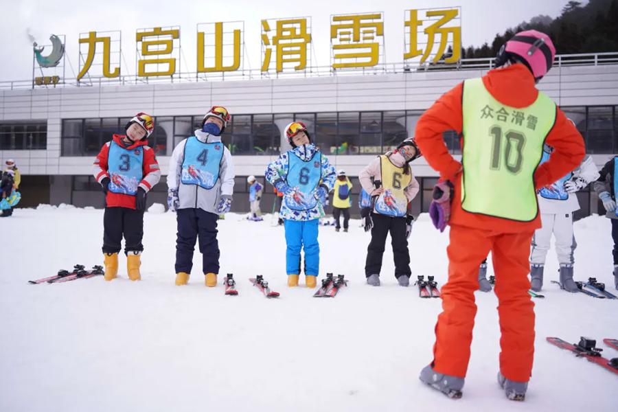 九宫山滑雪场,号称江南第一高山室外滑雪场,滑雪场面积约6万平方米,海拔约1559米,垂直落差约300米。雪场采用人造雪和天然雪相结合,雪质好、粘度大,适合开展大众滑雪和竞技滑雪。九宫山滑雪场拥有初级、中级雪道各一条,以及一条练习道,适合不同水平的滑雪爱好者。