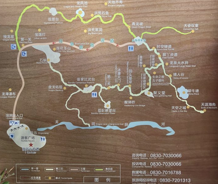 大黑洞景区——哆彩山场——游客中心——大黑洞——龙潭虎穴——第一关——莲花圣山——盘龙佑祖——迎客松——地下阴河——比武台——瞭望台——冰瀑天门——醒狮桥——回头是岸——聚义堂——下层宿营区——粮仓——上层宿营区——生命之根——犀牛塘——天涯海角——时光隧道