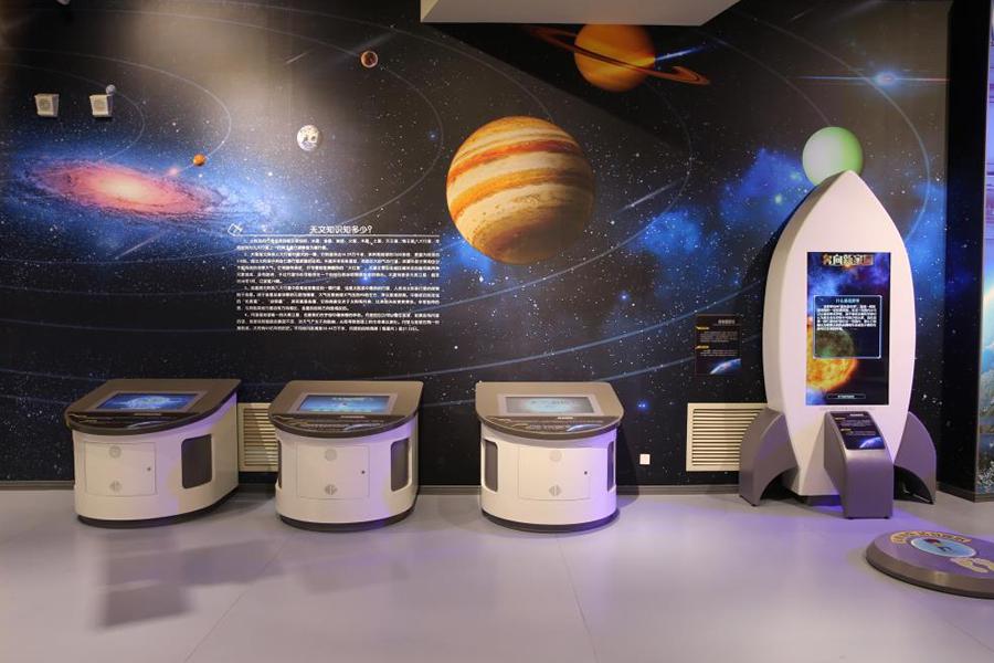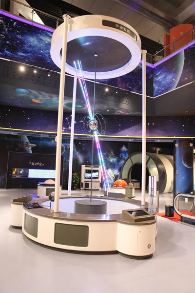 4枚火箭模型、5枚人造卫星模型醒目地摆设在展区内,这些都是根据实物严格以比例制作。还有神舟7号飞船模型。它是按1:2 的比例制作,由推进舱、返回舱、轨道舱组成,参观者可以了解到飞船的外观及内部结构,以及多媒体电脑介绍的载人飞船的知识。互动展品可以试驾。坐在神舟7号飞船航天驾驶模拟器的返回舱里,可以感受宇航员在太空飞行时的情形。月球车模型是按1:1比例制作的,游客可以通过操作驾驶体验在月球表面行驶的场景。走进“月夜星辰”小屋内,有一个美丽的模拟星空,只要你按下星座图上的按钮,就会在星空图上显示你对应的星座,小游客们都非常喜欢这个互动游览项目。