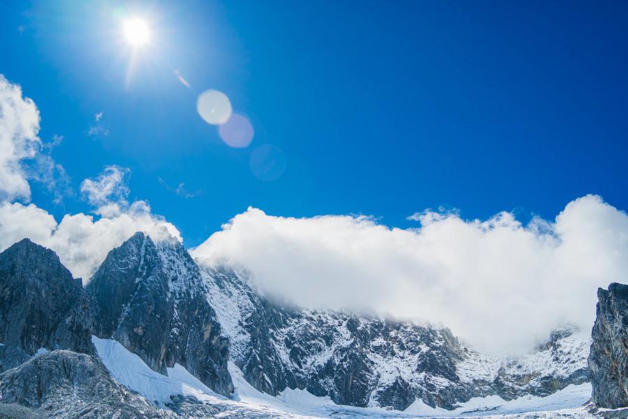 南滇第一峰,乘坐雪山大索道抵达冰川公园,沿着山间栈道近距离观赏冰川和主峰的雄姿。晨曦罩峰顶,多彩的霞光映染雪峰,白雪呈绯红状与彩霞掩映闪烁;傍晚,斜辉把雪峰染抹得像披上红纱,云朵带着晚霞,飞归峰间谷壑。