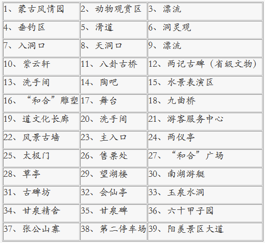全程:张公洞牌坊-两仪亭-和合广场-两记亭-张公洞-袖管洞—海屋大场-海王厅-水鼻洞-天桥—万福来朝—地道洞—洞中洞-洞天福地—云梯-洞灵观-地下河探险—漂流—陶艺馆—庚桑步行街