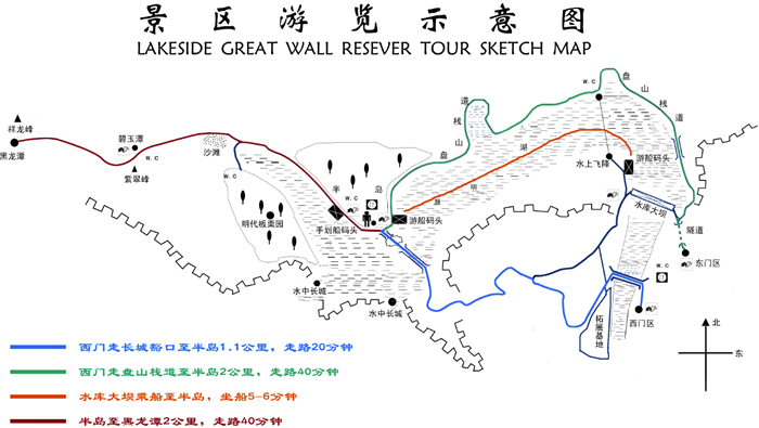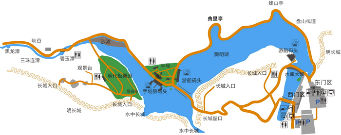 灏明湖、水中长城、明长城 、盘山栈道、沙滩、明代板栗园、清灵谷、碧玉潭、山泉、湖心半岛、黑龙潭