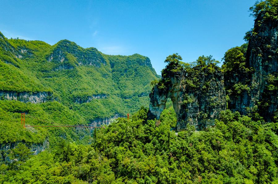 九路寨生态旅游区沟谷相通,溪涧回环。黄龙洞岩壁和洞口的树就像龙须,十分壮观。站在峡谷索桥上看到独特的景观象鼻山。楚王峰是九路寨最具魅力的山峰。蜡烛峰是九路寨绝景之一。徒步登山沿着山间感受溪水的清凉。