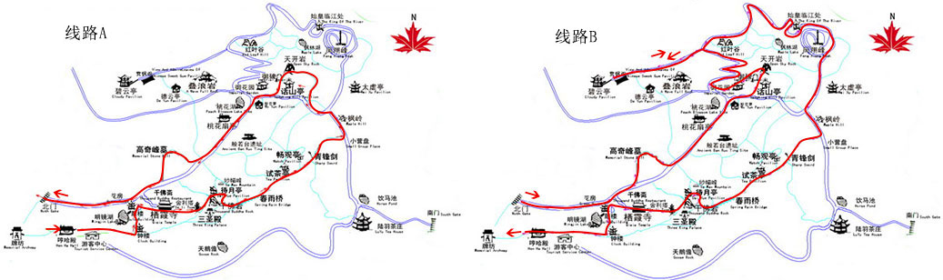 线路B:景区入口处、彩虹明镜、桃花扇亭、桃花湖、虎山碧云亭、读枫阁、始皇临江处、太虚亭、话山亭(终点返回)
