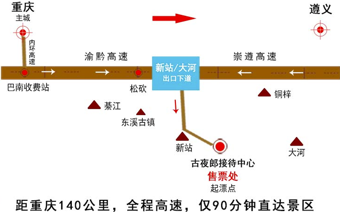 全程大约140公里重庆主城市区——渝黔高速(南坪可在四公里上高速)——綦江(往贵阳遵义方向行驶方向)——在新站、大河下道——经过太白收费站——下道左转沿途有路标走大约5分钟即可到景区。自驾车的朋友,在遵崇高速的新站收费站下到后,就有指示通往古夜郎漂流起点的大型广告牌,此时距漂流起点还有5公里,一会儿就到了。
