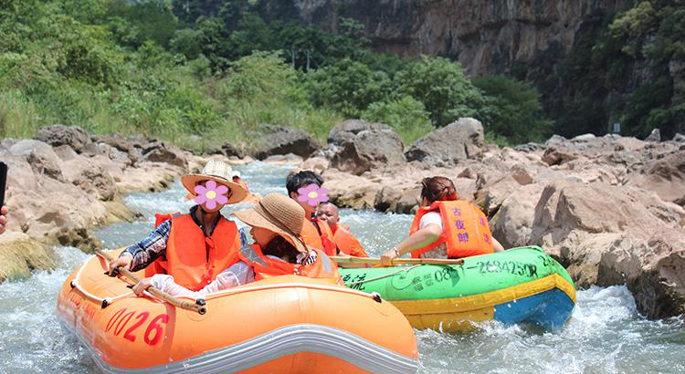 古夜郎漂流起于金宝山处,止于蒙渡河大峡谷鲁班岩处。全长7公里,全程漂流用时大概3个小时左右。击浪花、闯激流、过险滩,水质清澈纯净,为消暑纳凉的绝佳胜地。漂流沿途经过姊妹滩、上龙滩等二十多个险滩和千尺潭、蛇龙潭等十多个深潭,为游客带来惊险刺激的体验。