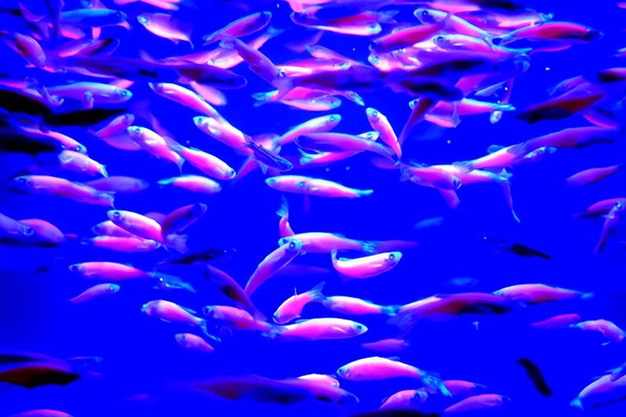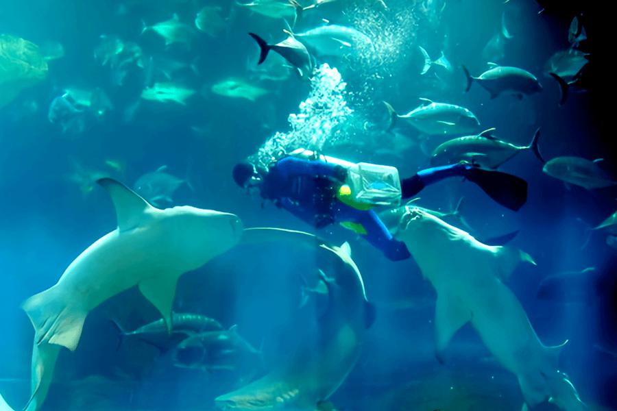 数万尾来自世界各地的珍稀海洋生物,长4米的南非沙虎鲨,有“魔鬼鱼”之称的黑斑条尾魟等。上千只水母在灯光映射下争奇斗艳,憨态可掬的海豹、海狮和企鹅。海底隧道是青岛海底世界一大亮点。“人鲨共舞”的壮观场面。