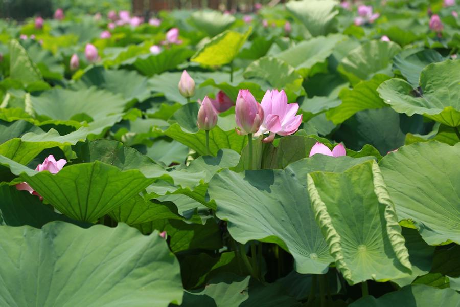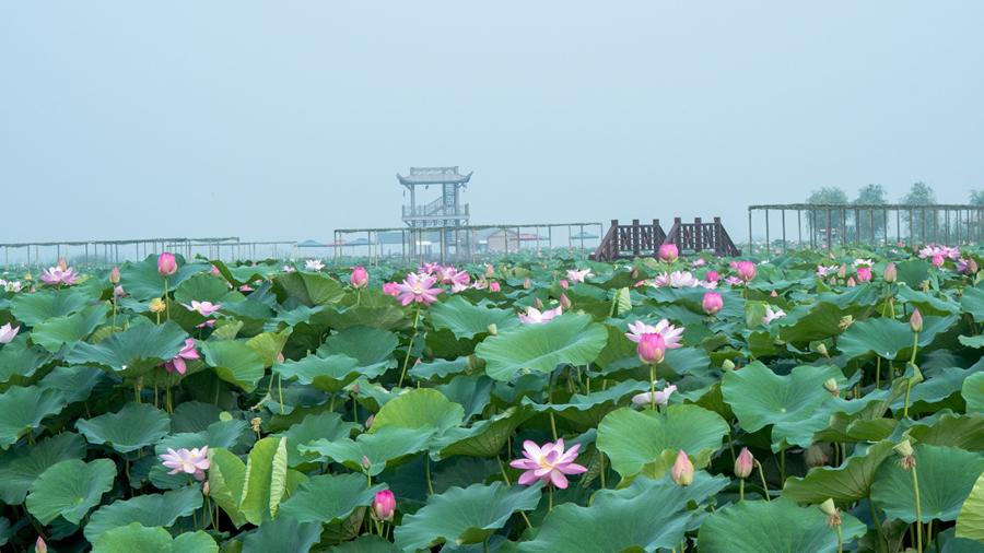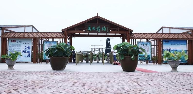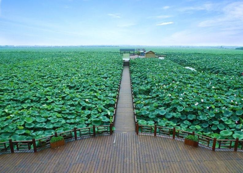 兴化万亩荷塘景区有漂亮女孩、友谊牡丹莲、剑舞莲等珍贵睡莲品种,引进了荷花一百余种。木栈道长约800米睡莲带,间隔式植入了适宜生长的世界各地的睡莲,万亩荷塘景区是荷花的世界,放眼望去,看不到边际的绿色。