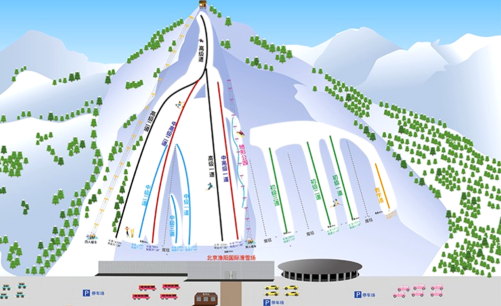 北京渔阳国际滑雪场,有高、中、初级雪道共12条,雪道占地面积约30余万平方米。高级道总长度增至约3200米,并设计有波浪道和猫跳道,增加了滑雪的挑战性和趣味性。滑雪场配备有双人缆车1条、四人缆车1条以及魔毯8条等先进的雪地运力设备,能够同时满足高、中、初级不同滑雪人群的需求。还提供高山摩托、滑草、雪上飞碟、马拉爬犁等丰富的雪上娱乐项目。