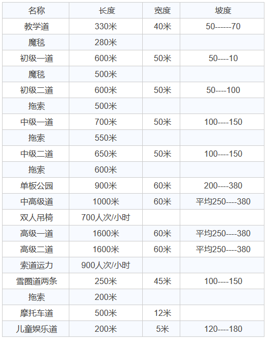 雪圈道2条,长度约250米,宽度约45米,坡度100-150%