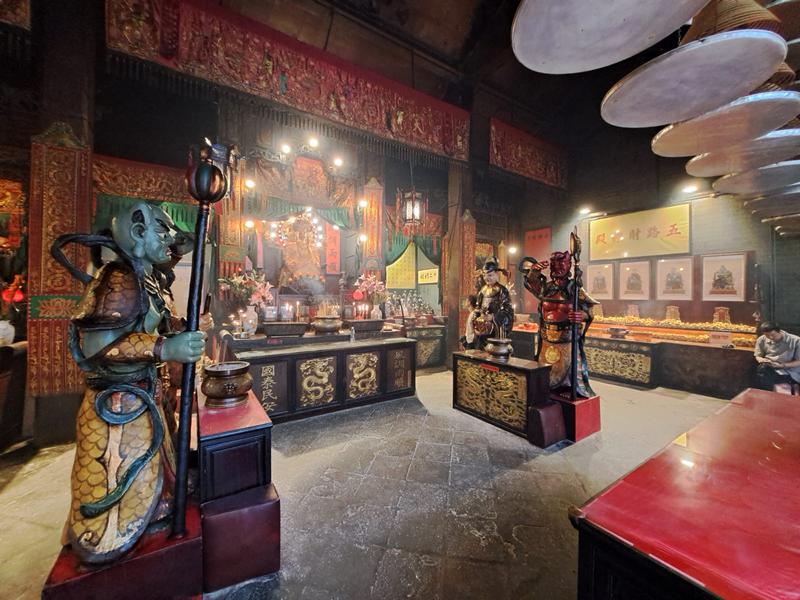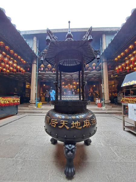 油麻地天后古庙屋顶采用硬山式设计,是香港九龙规模最大的天后庙,以天后庙正殿为中,两侧则建有油麻地观音楼、油麻地城隍庙、油麻地观音楼社坛及油麻地书院,各座建筑主祀不同的神灵。庙内珍藏文物如石狮、铜钟等。
