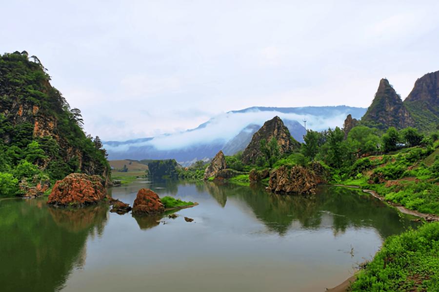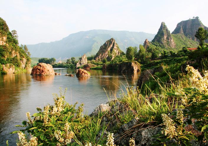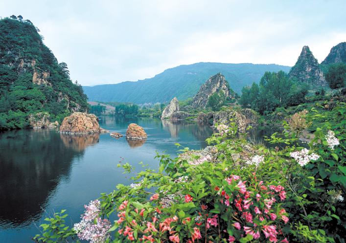 鸡冠秀峰顶端呈不规则的锯齿状一字排开,犹如巨型鸡冠矗立江边,远眺极象一雄鸡饮水。其山体倒映水中,山水一色,宛若仙境。春夏季映山红、山玫瑰等千姿百态的山花掩映,其状更象一个硕大的鸡冠。乘坐漂流皮筏又一特点。