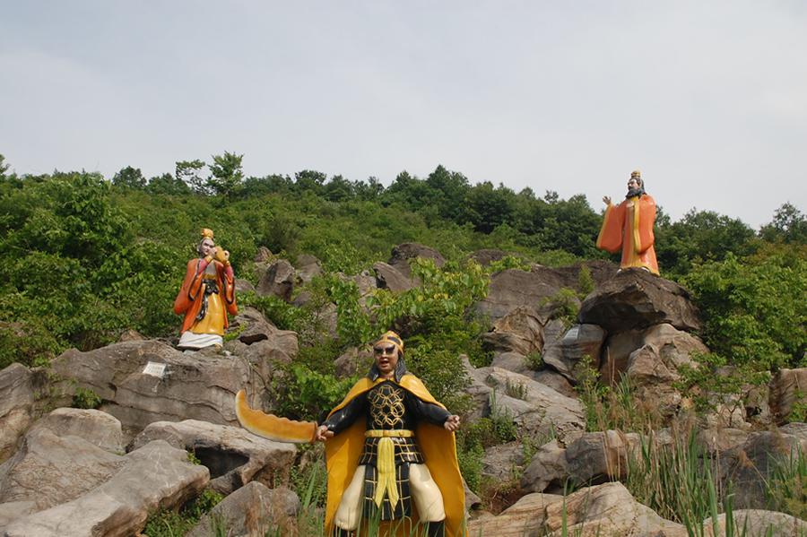 是八戒的温柔乡,充满八戒的趣事。一进入高老庄,就会被八戒的呆萌所吸引。八戒兵器九齿钉钯、天蓬元帅戏常娥、八戒背媳妇、八戒吃西瓜、八戒撒尿等经典情节的雕塑,将八戒搞笑憨厚的形象刻画栩栩如生。沿河长廊边有几十个青花瓷瓶,上面写满八戒的系列故事,令游客忍俊不禁。