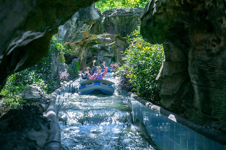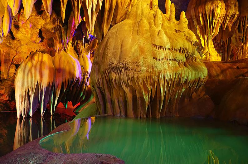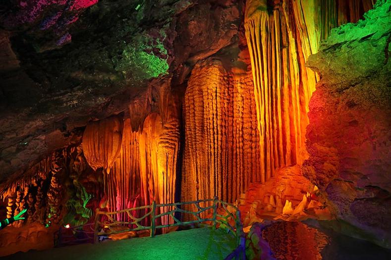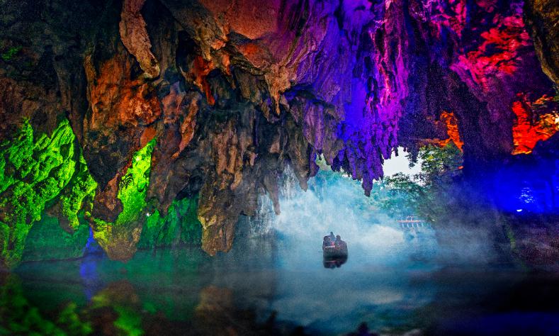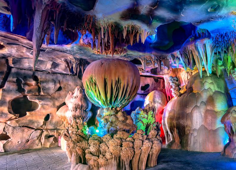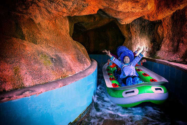 洞内石乳、石笋、石林造型奇特,宛如仙境的瑶池景观,梦幻深渊在深不见底的地下缝裂上用光影造隧道。洞穴漂流中落差较大较长弯道较多刺激的洞穴激情漂流。在场面壮观的数十种浪形智能变换的洞天海啸水世界中尽情欢乐。