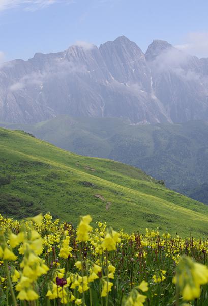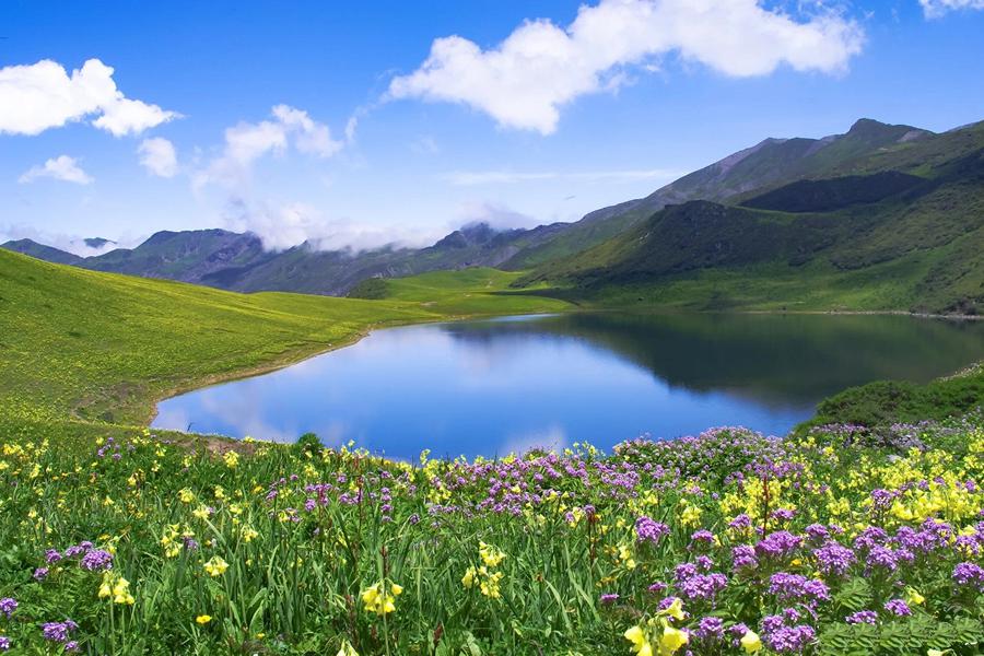 宽阔的高山草甸依山势而成,各色的野花遍布其间,从五月到十月份,杜鹃花、报春花、鸢尾花、紫菀花、翠雀花、马先蒿、绿绒蒿、西藏杓兰等,不同海拔高度上的数不清种类的野花依次开放,就像一座绚丽多彩的天国花园。