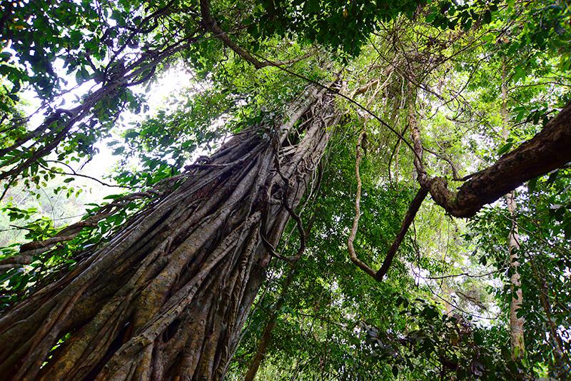 绞杀是热带雨林常见的一种生态景观,在沟谷雨林有一株上百年的绞杀榕,宿主已被绞杀,只留下一个通天空洞,可容纳几个大人站在树洞里,近距离感受更独特。打卡地点:东区沟谷雨林
