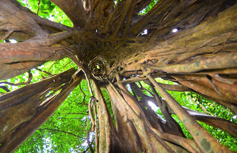 走进树藤缭绕的深林中,你看到漫天飞舞的树藤,是飘渺的线。而石头上却凝聚着粗浑之美,榕树上的热带鸟吱吱喳喳,如精灵一般跳跃在浓烈的绿丛中。