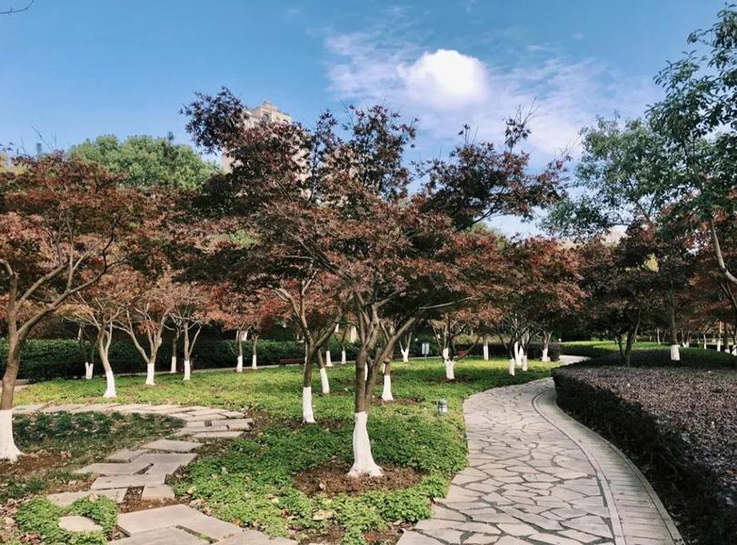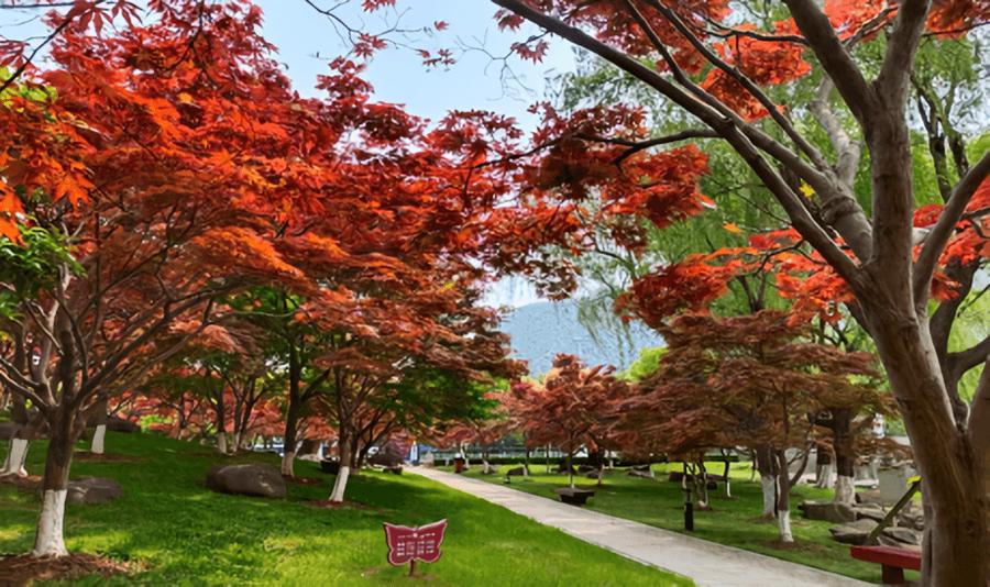 每到深秋时节(大约10月下旬至11月),红枫林的枫叶逐渐由绿变红,整片树林仿佛被火焰点燃,又如晚霞般绚烂。阳光透过枫叶的缝隙洒在地面上,形成斑驳的光影,美不胜收。除了主打的红色枫叶外,景区内还种植了其他色彩的树木,如黄色的枫叶和常绿的树木等。这些色彩相互交织、映衬,使得整个红枫林呈现出一种丰富而和谐的视觉效果。