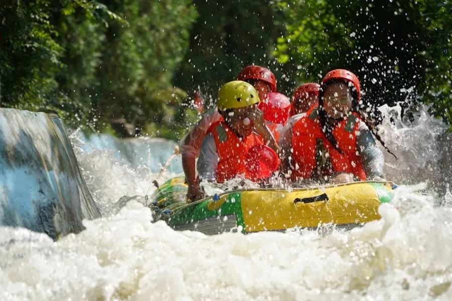 惊:由于落差大,乘坐的皮划艇高速滑行犹如浪尖上的过山车,飞旋在波峰波谷之间,尖叫之声伴你一路。