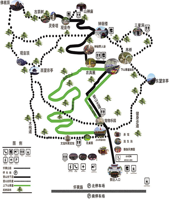 全长1488米,其中上行488米,下行1000米,采用安全可靠的管轨运行方式,集登山、游乐于一体,省时、省力,安全、可靠,乘坐滑道,既可免去登山的辛苦,还可以体验高山下滑的感觉,享受林间穿梭的乐趣。