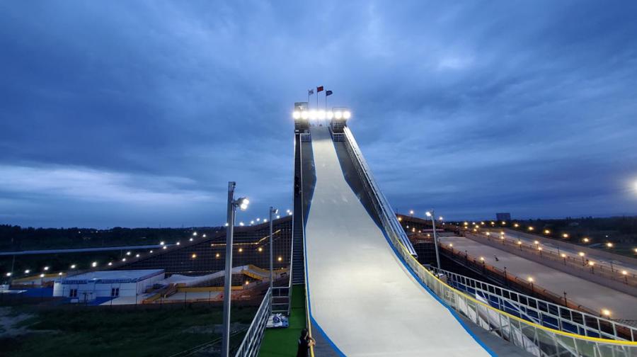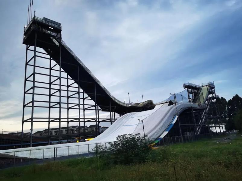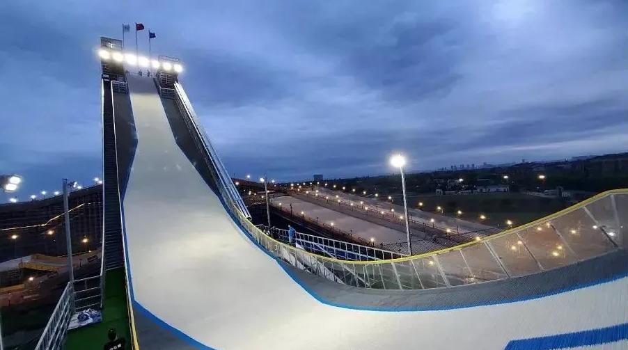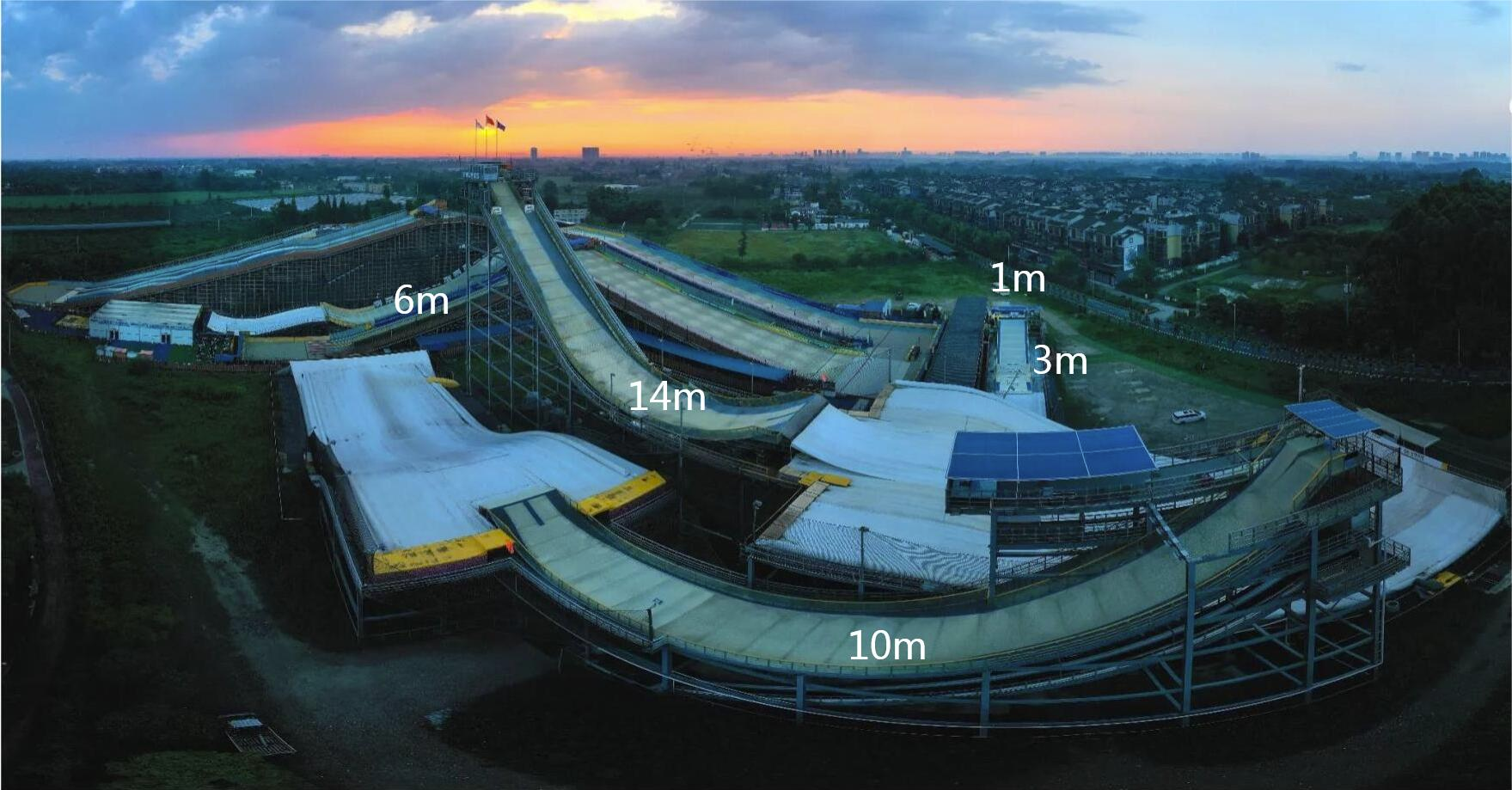 台前距约14米,总长约112.6米(出发平台长约2.3米,滑行段长约56.9米,气垫区长约53.4米),高度约43米,主要坡度约40%,滑道宽约10米,气垫宽约30米。