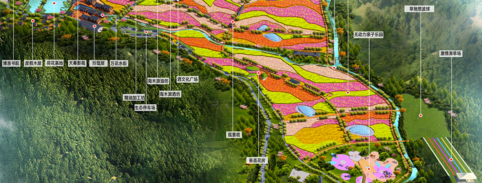 生态竹林漂流、棋盘山游步道、丛林穿越、拓展中心、孔雀园、游船码头、惊险吊桥、博恩书院等。毛斜民俗村、儿童游乐园、花海景观区、农业采摘园、美食街。建有生态大米生产基地、油茶生产基地、莲子基地、海木源酒坊、海木源特色小吃、农产品展示中心。
