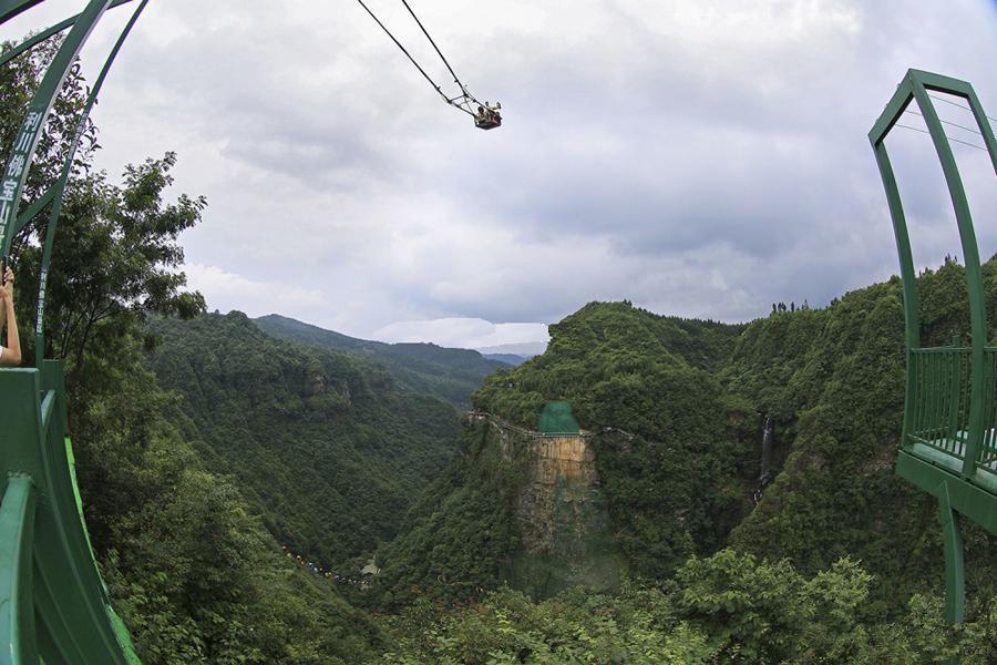 是在悬崖上空采用透明双层钢化玻璃作为踏板一步一步通过窄桥,项目具有挑战性。