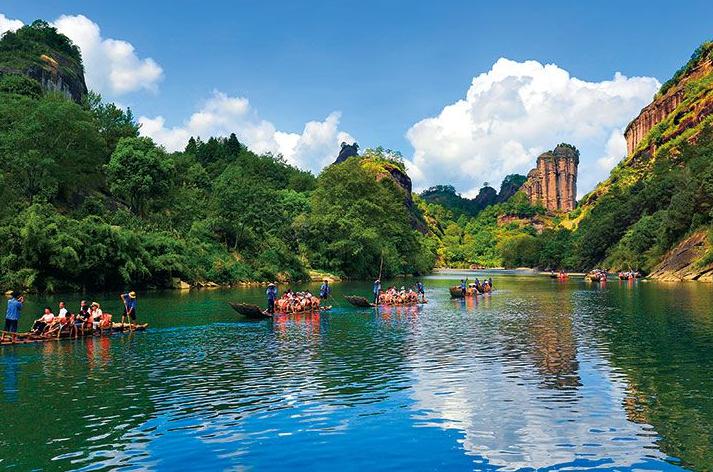 九曲溪,位于武夷山风景区内,九曲溪全长62.8公里,因地质断裂构造作用,有八滩五潭,折为九曲,顺流倒记数经九曲、八曲、七曲、六曲、五曲、四曲、三曲、二曲,然后到达一曲终点,汇入崇阳溪。下游9.5公里,溪水在群山中蜿蜒流淌,游客可以乘坐竹筏,顺着溪水漂流而下,欣赏沿途的壮丽景色。
