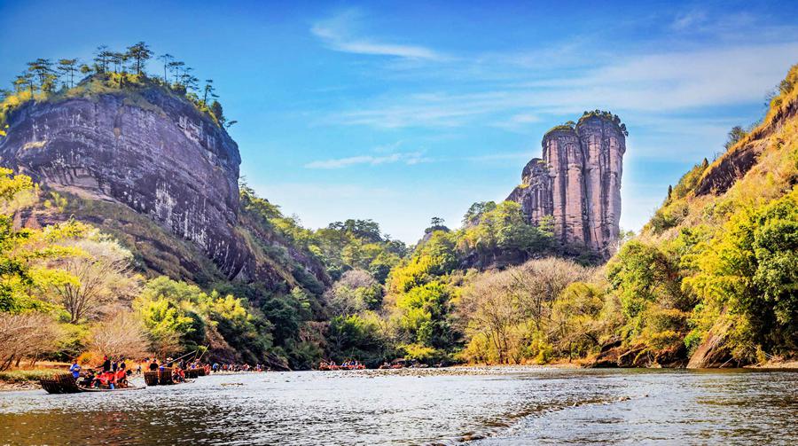 尽头是星村,九曲景点有:齐云峰、白云岩、双狮戏球石等。它们整体形成九曲清溪绕青峰的美妙景观,一般游览的主要方式是九曲溪漂流,乘坐竹筏泛溪观赏山景。