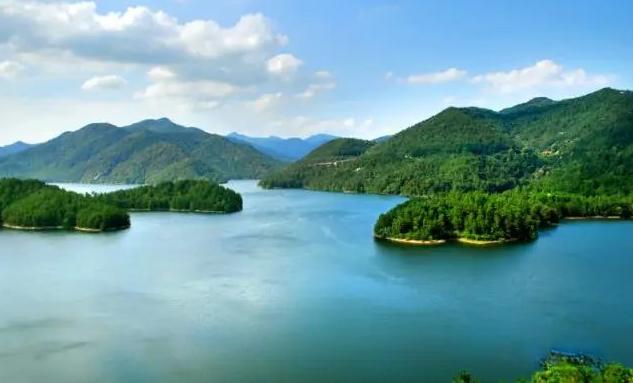 湖水清澈碧绿,湖岸蜿蜒曲折,群山环抱,湖内有自然形成的多个岛屿,岛上林木茂盛。在湖内泛舟,可以远眺天台山主峰,青山碧水尽收眼底。是避暑胜地。