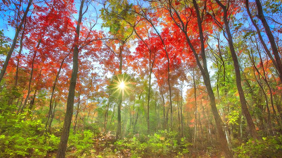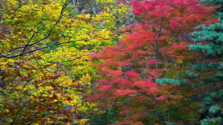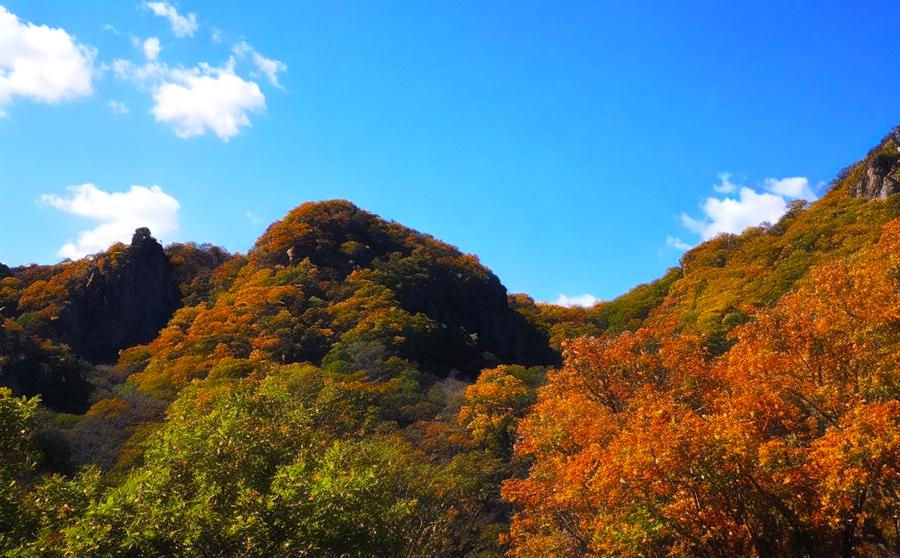 春有绿野、夏有飞瀑、秋有红叶、冬有冰雪。不同树种对霜冻的反应各不相同,有的火红,有的橘红,有的金黄,还有的形不成红叶,因此仍然碧绿等阳光下的红叶,艳丽异常。再加上这里的霜期比较长,红叶经受霜冻的时间更长,使红叶的色彩也就更加鲜艳。