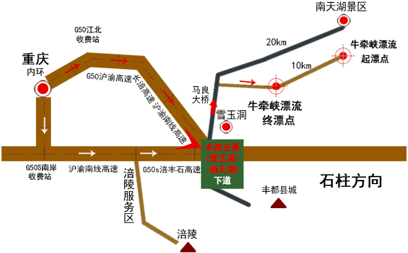 1、重沪渝南线高速:重庆—丰都(雪玉洞)下道—往雪玉洞方向—过马良大桥2公里—漂流终点(丰都至景点沿途有路标指示)