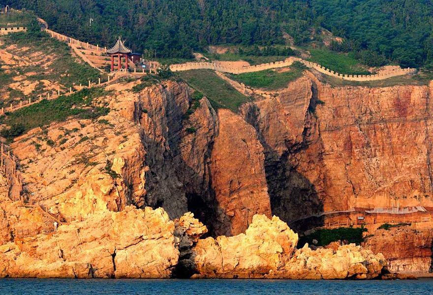 位于北长山岛的西北角,西依珍珠门水道,北邻国际航线长山水道,崖壁绵延400余米,尤以其崖壁罕见的石质组合和高峻险要而著称,在全国众多海蚀崖中独占鳌头。亿年前的燕山构造运动和喜玛拉雅山造山运动形成的,峭壁燕梭高69.7米,由于千万年来风浪的侵蚀,渐成了上凸下凹之势。夏日炎炎,崖上和崖下的温度竟能相差10多度,大有阴阳割昏晓之意境。