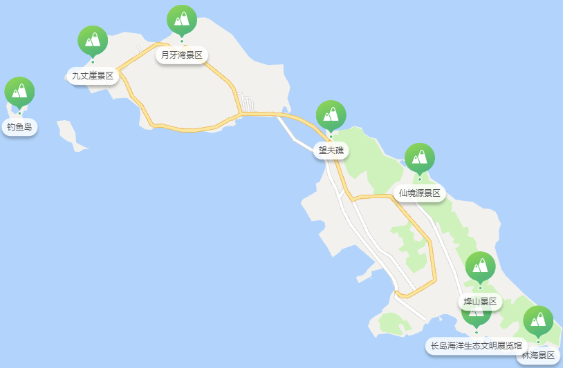 九丈崖景区、月牙湾又称半月湾景区、林海景区、烽山景区、望夫礁景区、仙境源景区、长岛海洋生态展览馆、老海岛事迹陈列馆等。主要景点集中在北长山岛(北线)和南长山岛(南线)上。长岛无岛不秀,无岛不奇,是一处天然的海上大花园。