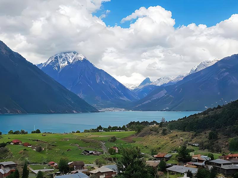 巴松措又名错高湖,巴松措是藏语中“绿色的水”的意思,在藏族传统诗歌中,巴松措常被比喻成一位隐藏在深山的女神。巴松措是红教(藏传佛教宁玛派)的一处著名神湖和圣地。巴松措长约18公里,湖面面积约27平方公里,最深处达120米,海拔3480米。湖面开阔,湖水清澈,碧波荡漾,四周青山环绕,山顶冰雪覆盖,在阳光下闪着银光。蓝天白云,青山绿水,交相辉映。湖边房舍错落,一湖如带,湿地从湖边村缓缓延展至湖畔,而海拔6300多米的杰青那拉嘎布雪山,照映在湖面,宛如一座世外桃源小仙境。