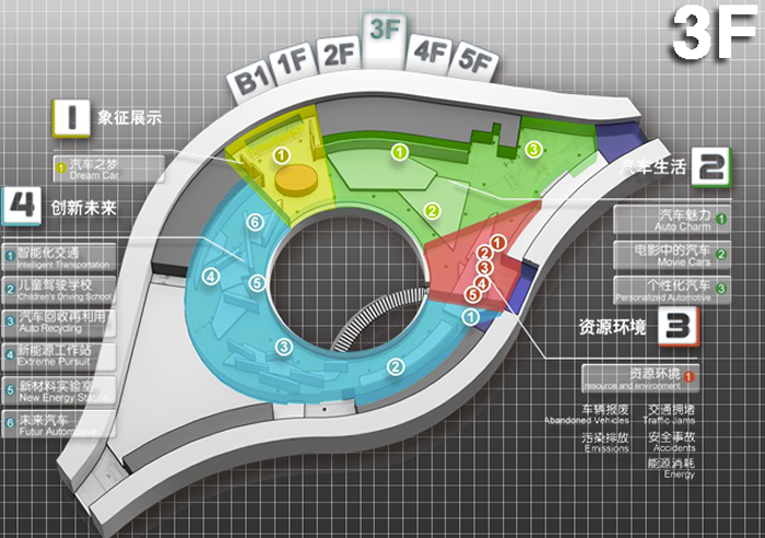 未来馆,设有象征展示、汽车生活、资源环境和创新未来4个展区及15个主题,展出车辆10辆,展陈面积3029平方米。未来馆的展陈设计以调动观众的情绪与思维为目的,通过更加新颖、更加灵活和更加艺术化的展示方式吸引观众的目光,引发观众的思考,与观众一起共同探索汽车美好的明天。