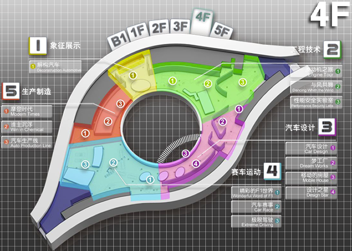 观众可以了解到发动机的种类、构造和工作原理。通过模拟风洞体验空气动力学的相关知识,通过先进的展示技术了解汽车底盘的相关技术和安全措施。