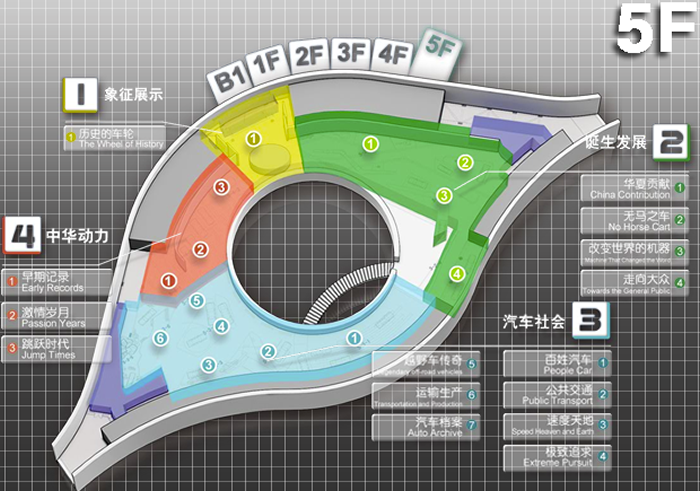 设有“早期记录”、“激情岁月”、“跳跃的时代”三个主题,展示中国汽车工业的艰辛历程和中国汽车人的不断追求。