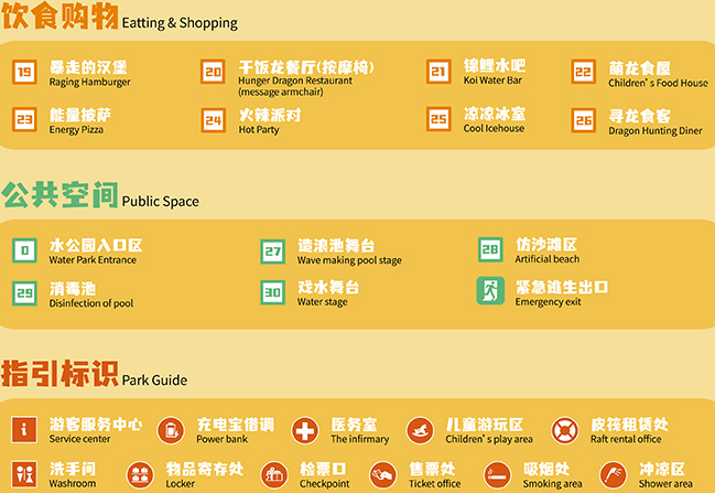 造浪池、龙门水寨、双轨过山车、贪吃龙滑道、卧龙滑道、时光隧道、激情水上漂、眼镜蛇滑道、巨兽碗、萌龙戏水池、极速滑道、合家欢滑道、飞毯&大黄蜂滑道等