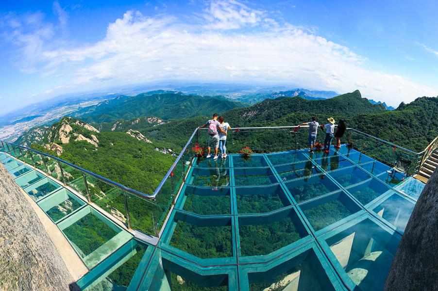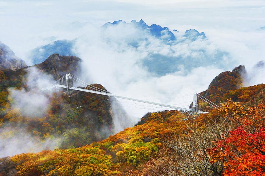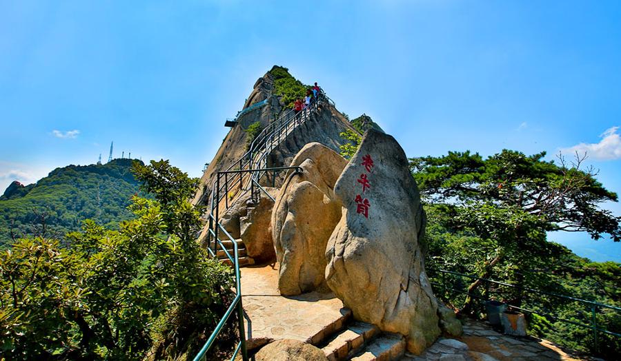 老牛背如巨牛横卧,脊背狭窄,两侧悬崖峭壁;透明的玻璃铺设在悬崖之上,脚下是幽深谷底;早起登上山顶看日出,云海在脚下翻腾。秋日红叶浪漫迷人,站在玻璃桥上,可俯瞰到山下壮丽的枫叶海洋;夏季清凉避暑好去处。