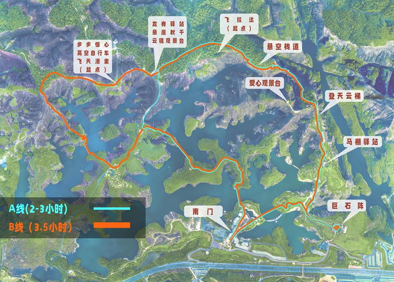 整个景区呈一个环形旅游路线,大概需要2-3小时左右游玩一圈,全程步行游览。娱乐有近90度垂直岩壁上的攀岩、峡谷之上的玻璃桥、云镜观景台、悬崖秋千、高空自行车、高空索道等。