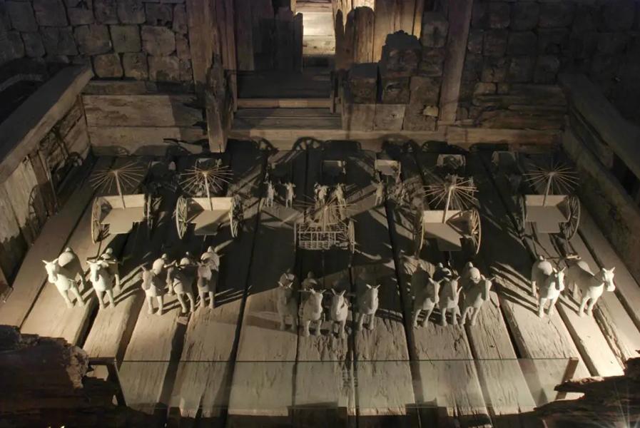 第一层为外藏椁,是侍女、婢女生活的场所,也是厨厩所在,出土了大量男女木俑、车马具、粗糙的生活用具和炊具等随葬品。